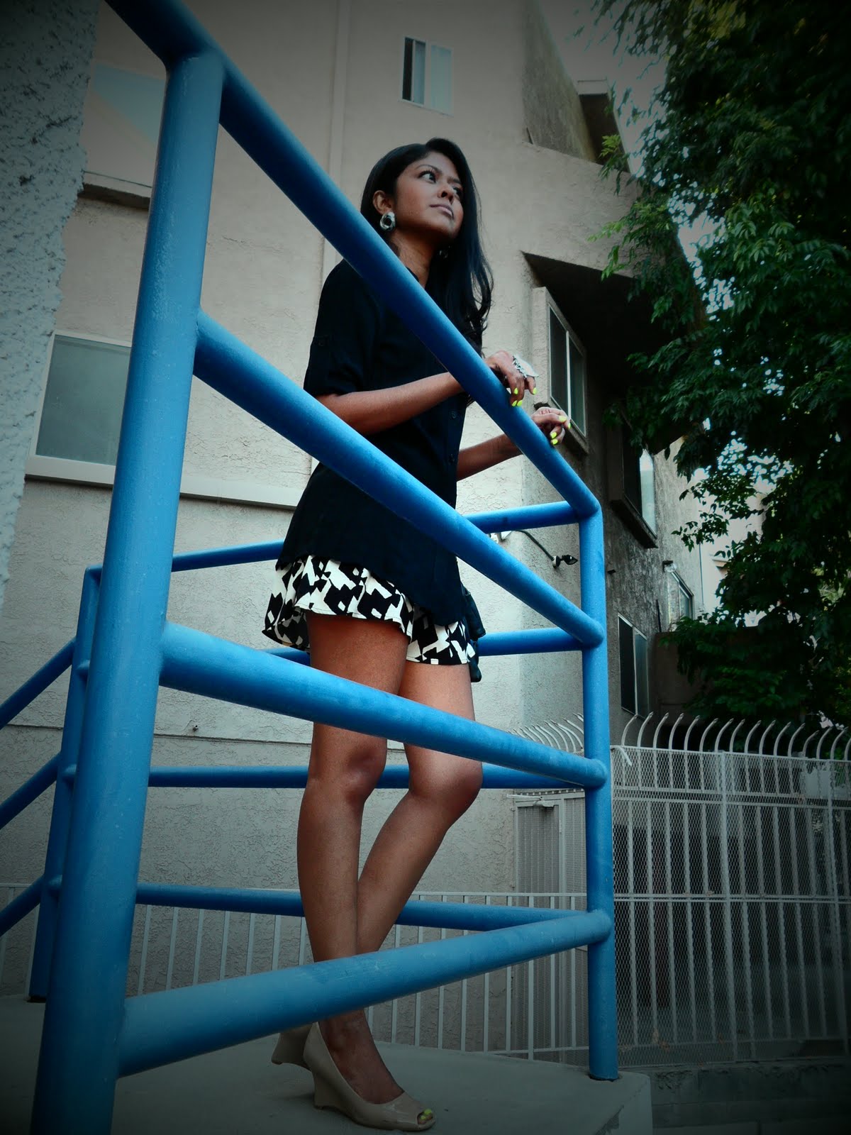 Summer’s finally here and I was thinking it’s time to show some legs so I picked out this printed shorts, a button down top and my favorite nude wedge heels.