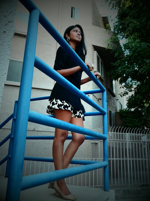 Wearing, final touch top, audrey printed shorts, C&K wedge heels, black studded purse from Singapore, aldo earrings and www.fashionology.nl ring