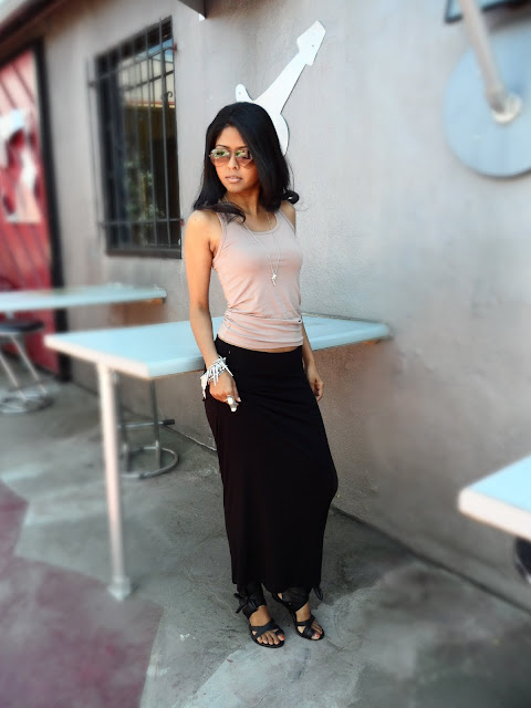 Wearing F21 skirt, basic nude tank top, Spiky bracelet from Melrose Ave, Ring and necklace from www.fashionology.nl and Jeffery Campbells wraparound flats.