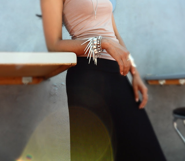 I have not worn a long skirt in years, as I am mostly either in jeans or leggings. I am starting to love skirts again, long skirts especially. This one in particular is really basic which means I can dress it up or down. This Spiky bracelet is my current favorite summer accessory, I have used it way too many times. I’ve even got the spiky necklace in silver and antique gold.