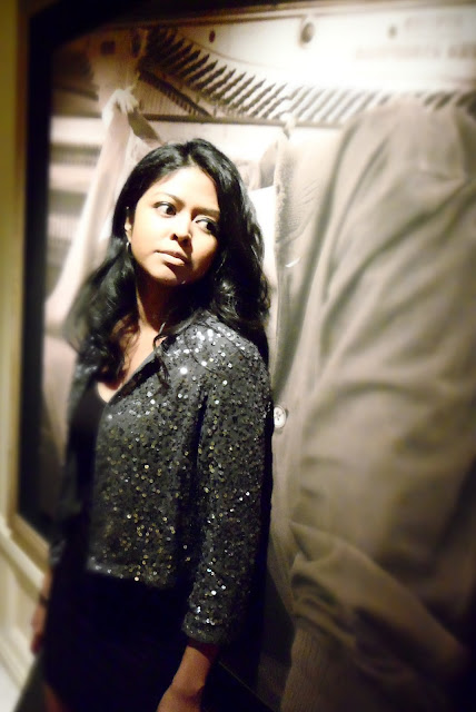 Wearing American Apparel black seamless dress, Urban Outfitters sequin jacket, Clutch from Melrose Avenue, C&K grey pumps.