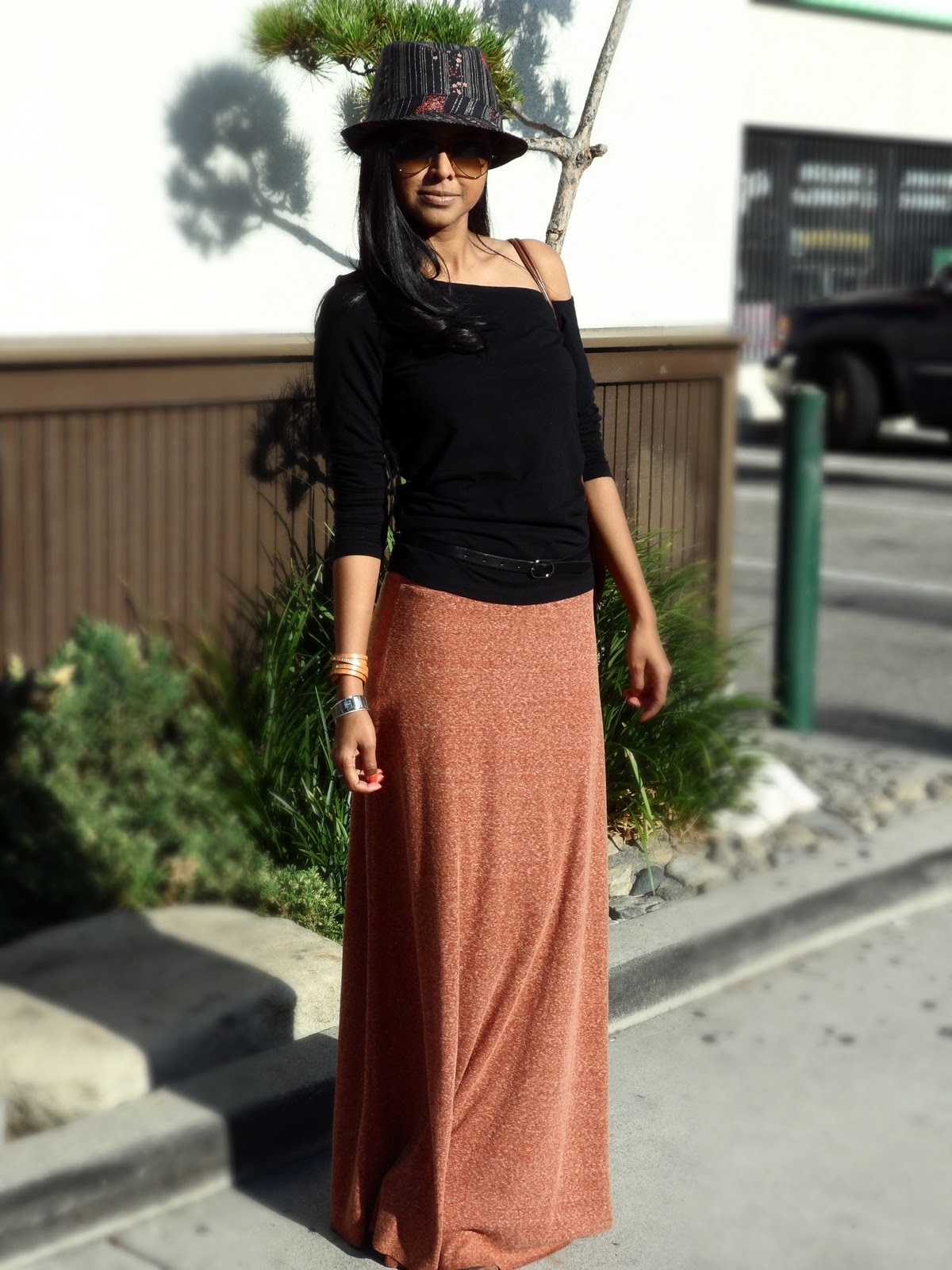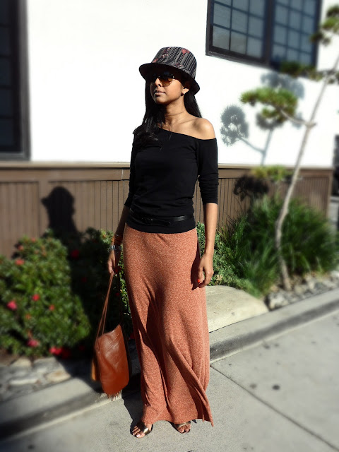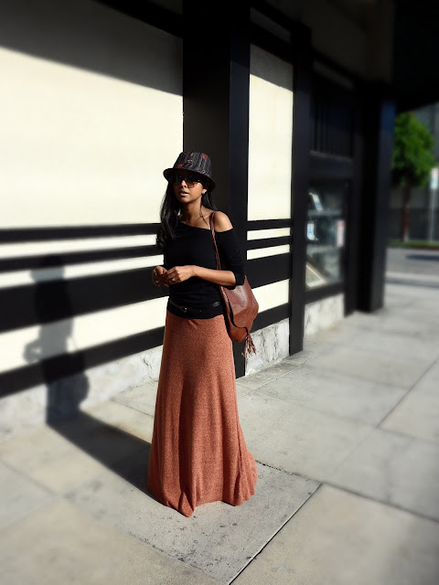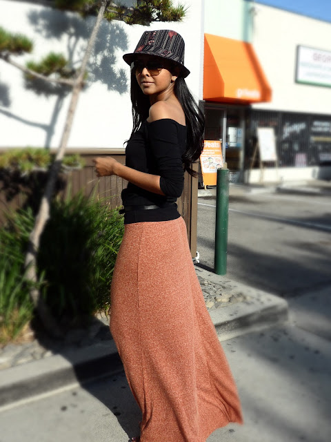 Today I felt I wanted to incorporate a little bohemian element to my outfit, so I picked out this full skirt I purchased recently at Zara. I love the color and the fabric, paired it with an asymmetrical off shoulder top, skinny belt and my new obsession, the Fedora.
