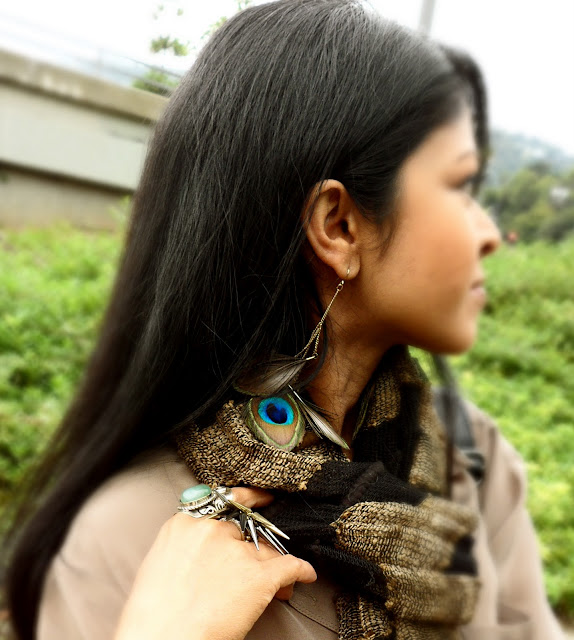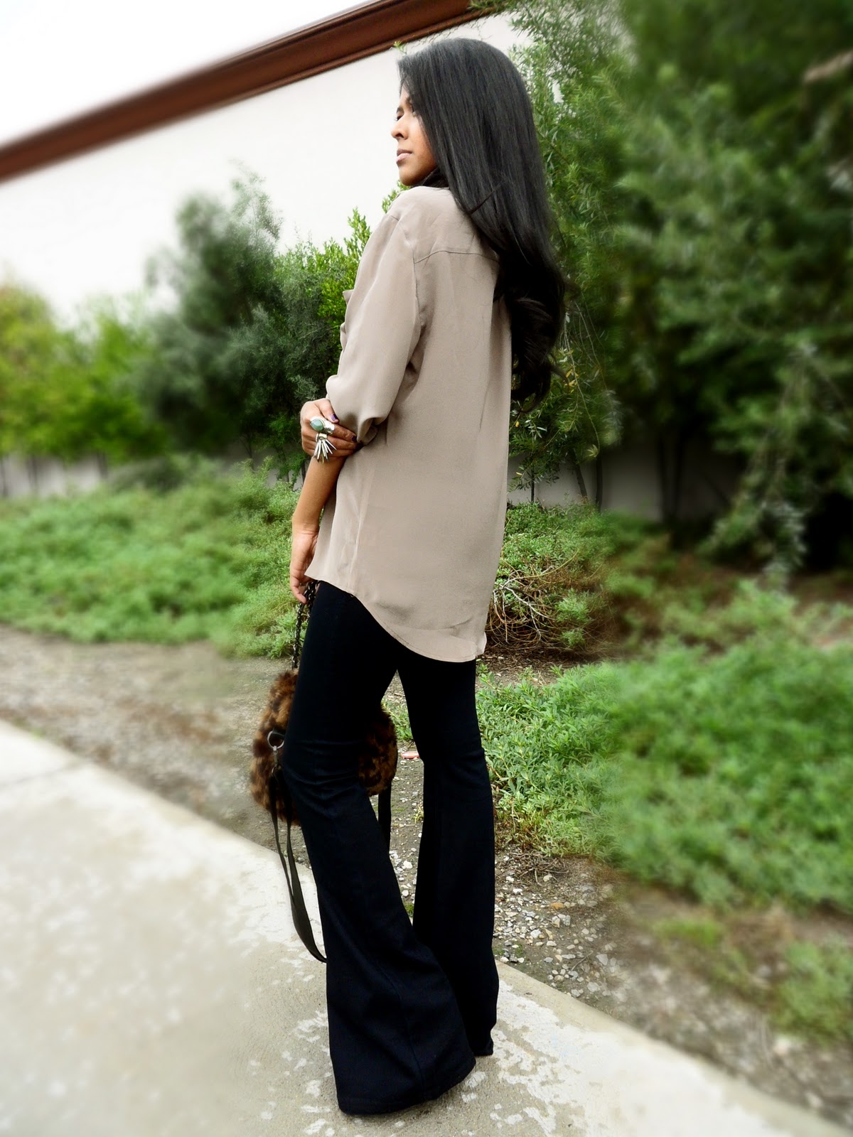 I chose this 70s flare jeans which have been sitting in my closet for months just because I’ve been infatuated with skinny jeans for a long time. However today, I wanted to bring back a 70’s fashion vibe so I paired it with a silk button down taupe shirt, threw on some peacock earrings and wrapped my neck with this beautiful scarf that I got from India ages ago. I am really thrilled that I found this silk shirt from Urban Outfitters, similar to the Elizabeth and James Bonfire belted crepe shirt which i have been lusting over for Fall, at a much more affordable price.