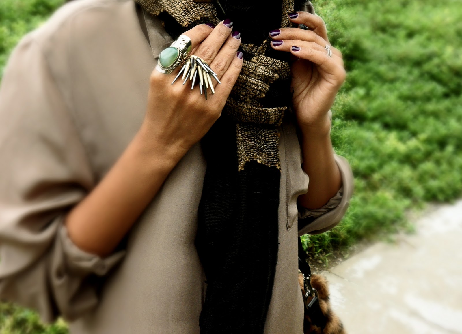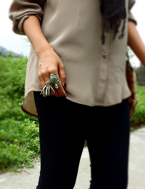 Wearing vintage jeans, UO silk shirt, scarf from India, bag from Zara, spiky ring from Melrose Ave, Green Jade ring from Peru, earrings from F21.