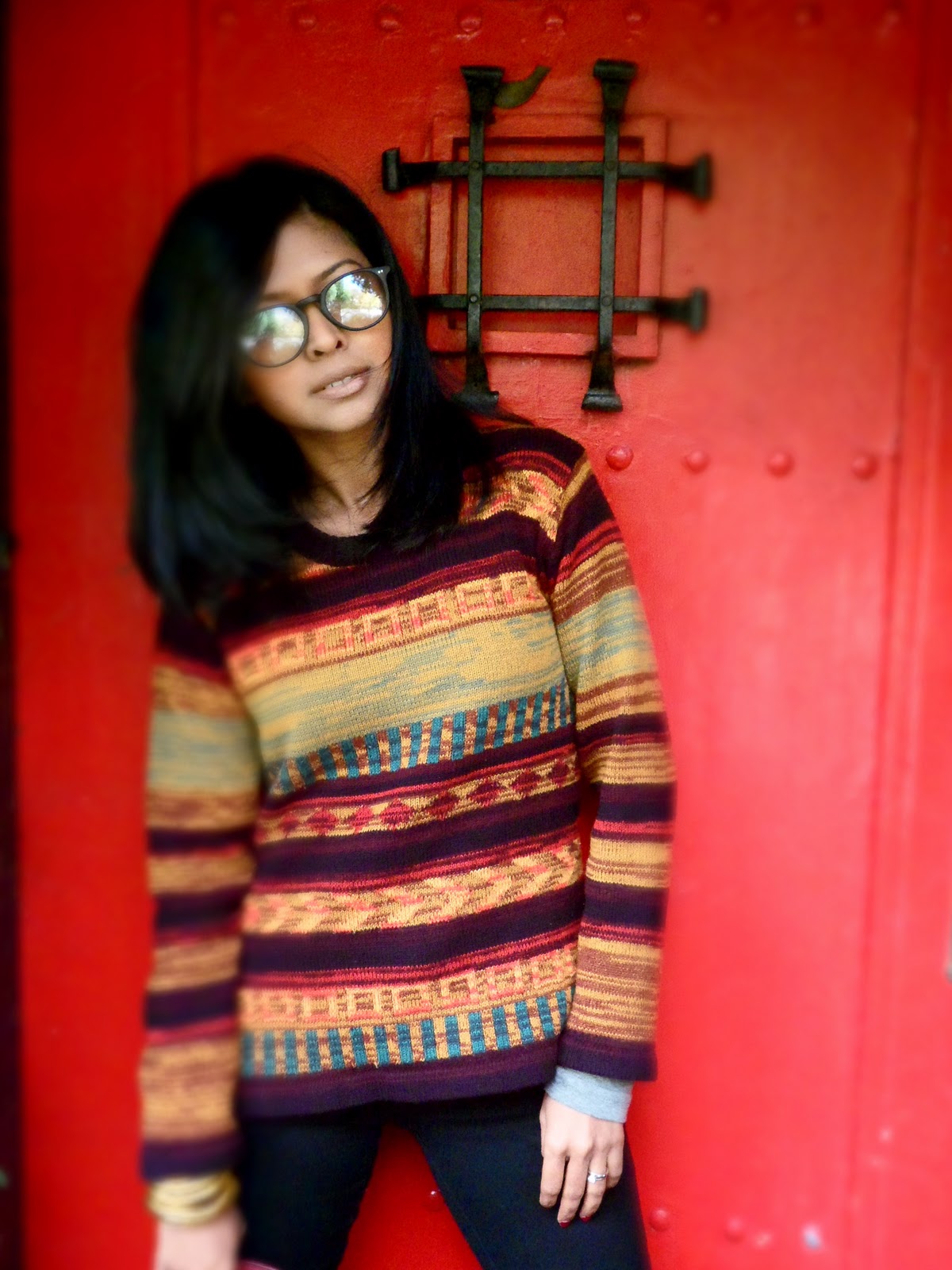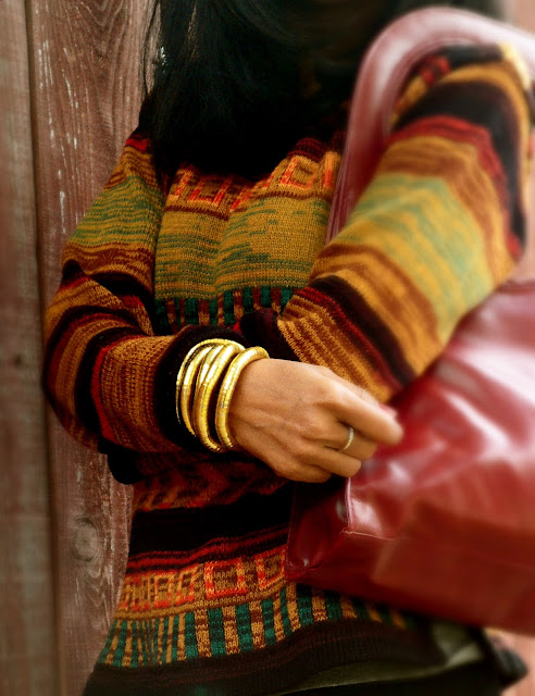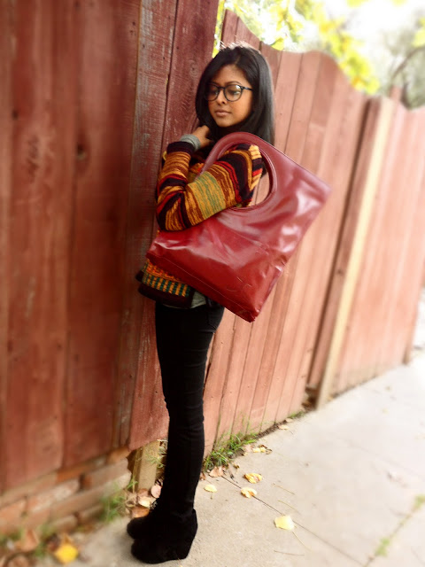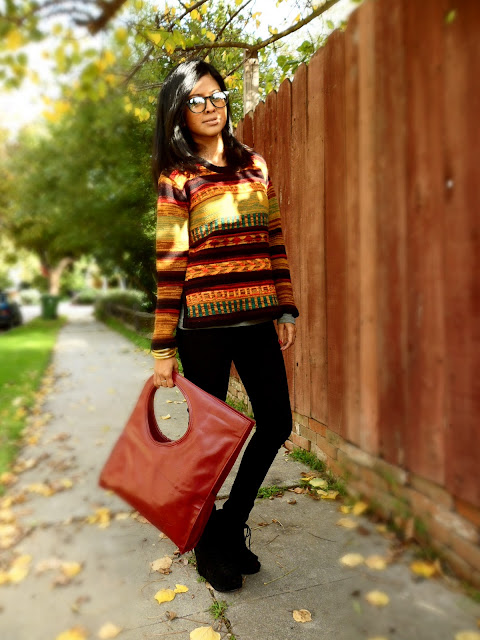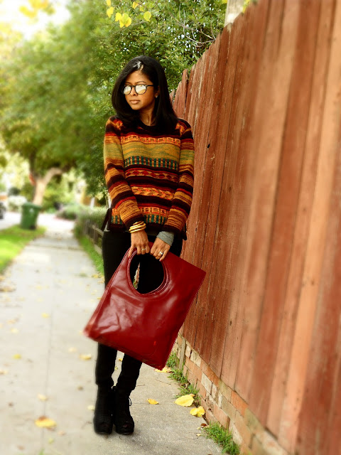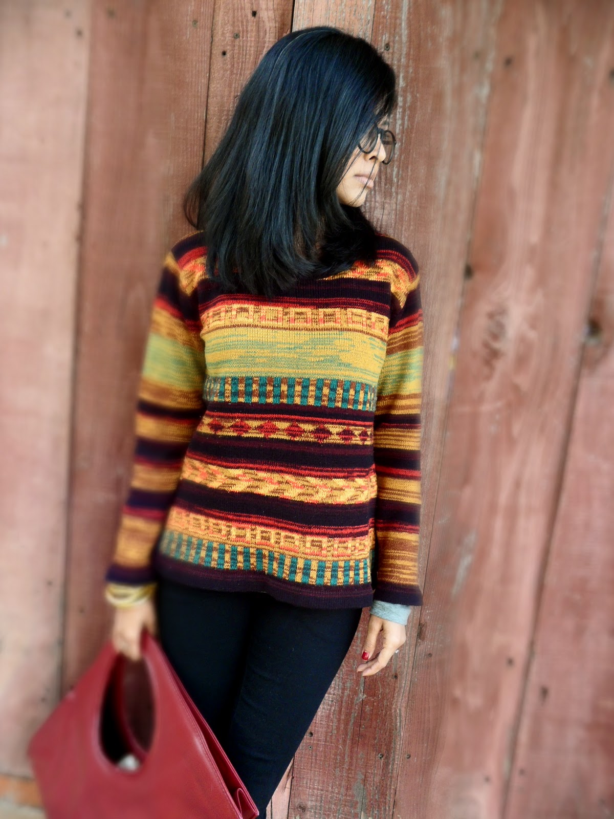 Since Thanksgiving is coming up I thought I’d put together this native American inspired outfit. I found this sweater just a couple days ago at a vintage store. The colors on this sweater immediately caught my eye and I knew it would be great for this winter. As I was rampaging through my closet for the right handbag to go with this outfit, I found this perfect boxy red bag which was a gift from a girlfriend back in Singapore.