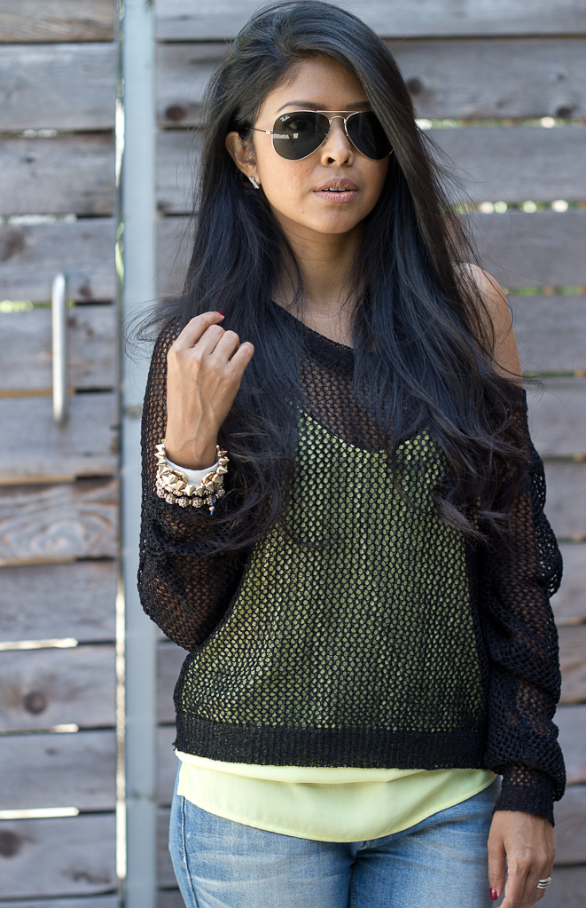Wearing Yellow hi-low tank by Lush Clothing, fishnet top from Forever 21, boyfriend jeans from Urban Outfitters and heels from Zara.
