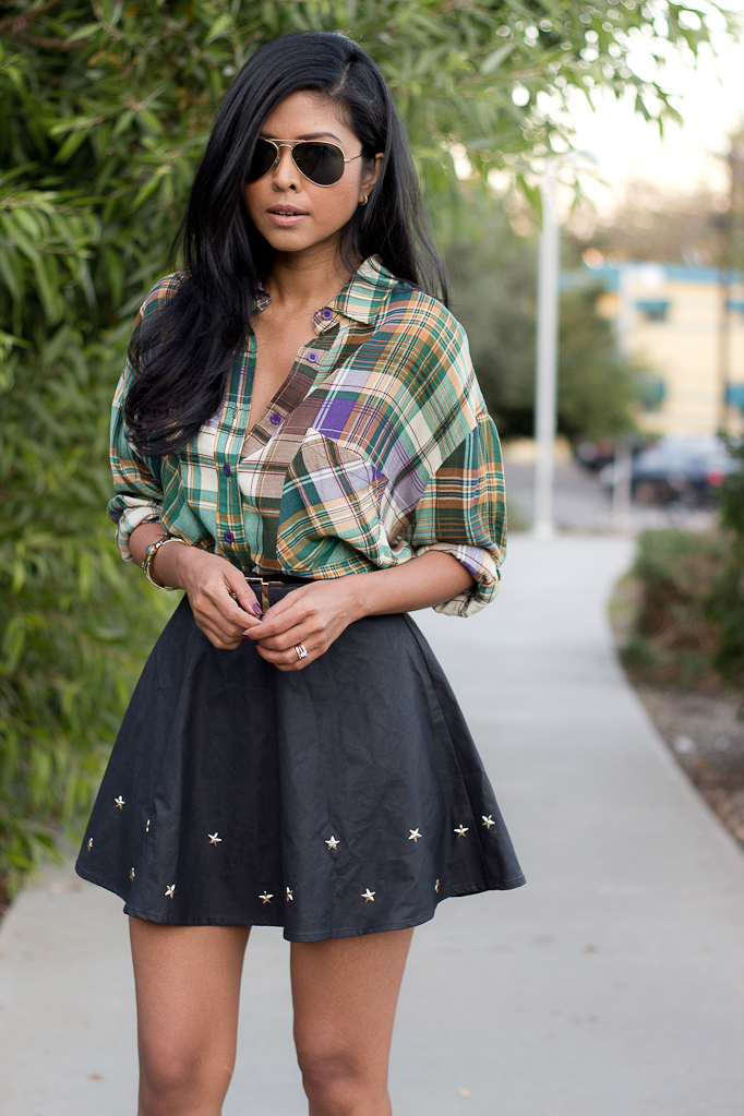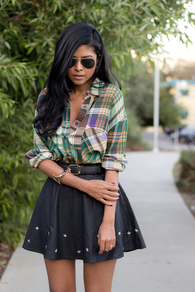 Top: Plaid Boyfriend Top c/o SwayChic / Skirt: Lulus / Shoes: ALDO / Jewelry: House of Harlow cuff c/o Glamboutique
