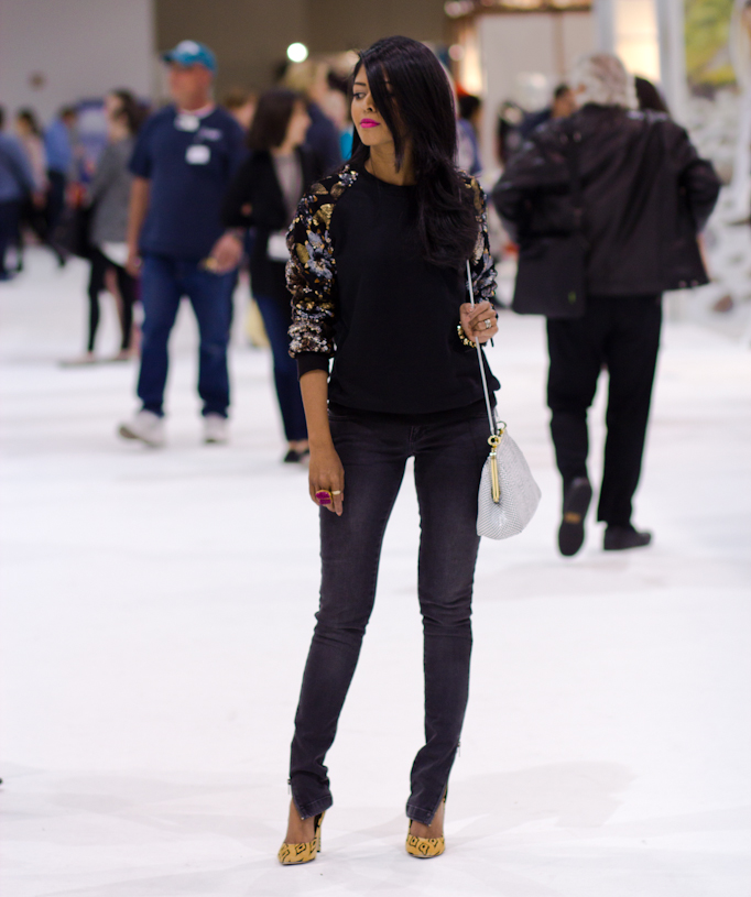 Top: Sequin sleeve sweatshirt by Navie / Jeans: c/o Anine Bing / Shoes: Fergie pumps c/o Sole Society / Bag: Vintage / Ring: Barbie c/o Beso Beso by Luka