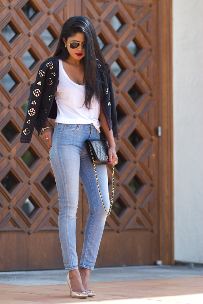 This time I went for a classic boho look. I started with a white tank by Helmut Lang tucked into a Blue high waisted Skinny jeans by Mother Denim and completed it by adding this mirrored jacket for a East meets West look.