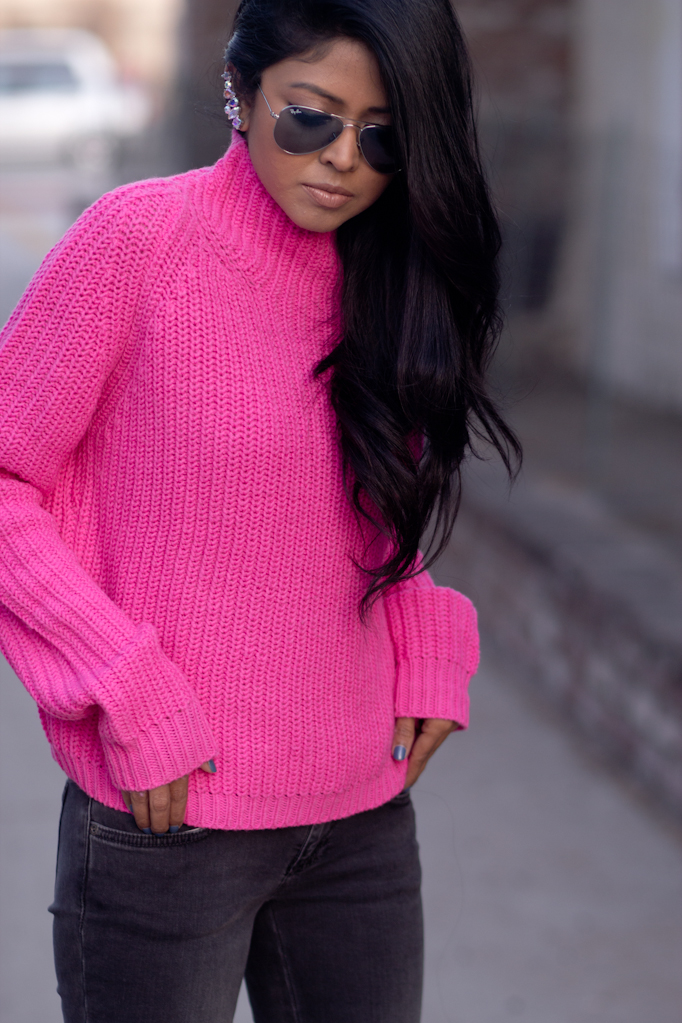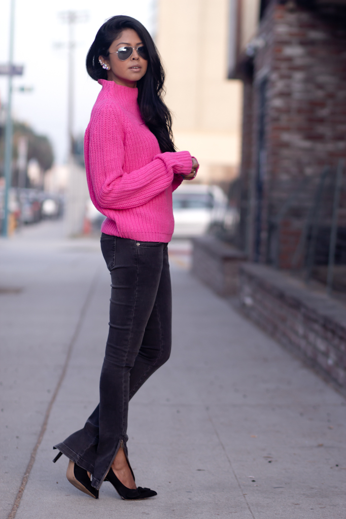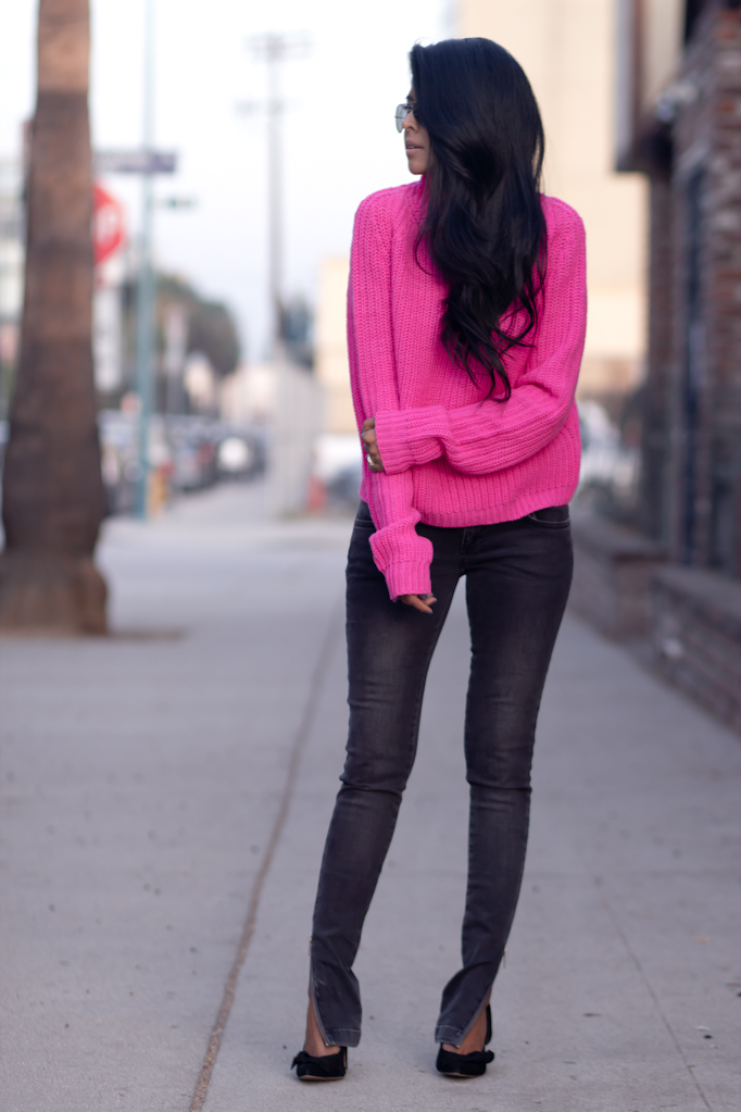Top: Agnes Sweater in Neon Pink c/o Torn By Ronny Kobo / Jeans: Anine Bing / Shoes: Sole Society / Bag: Rovi Moss / Ear Cuff: c/o Bebe