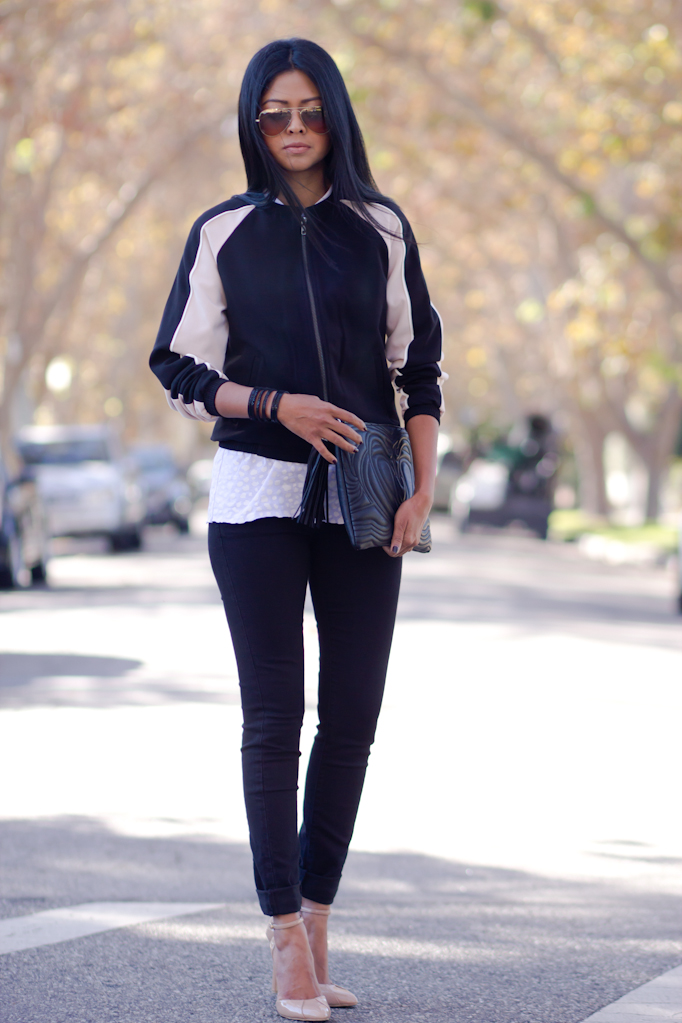 Let’s just talk about this track jacket. An unbelievable piece I found at Target for only $29.99. Everything about it is perfect. The fit, black & white with a touch of blush, down to the soft fabric is just amazing. I truly love the simplicity of it as well. The track jacket itself is a sporty piece but the blush tone adds that demure, feminine look to it, don’t you agree? I kept the entire look simple by styling it with a white round neck tank with subtle leopard print and black skinny jeans. There are so many options with this jacket and I can’t wait to play around with it and style it in different ways. It’s not available online right now but I am pretty sure you can find it at a store near you, so make a quick visit to grab this pretty piece 🙂