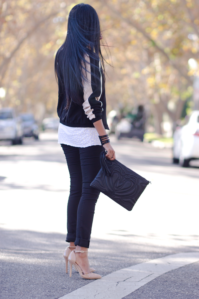 Top: This is a love song / Jacket: c/o Target / Jeans: Stewart Jeggings c/o Duffie / Clutch: H&M / Shoes: Sole Society / Jewelry: Ted Rossi