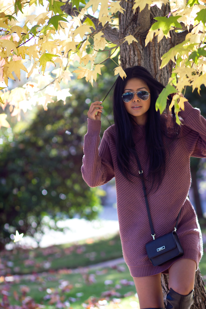To offset the subdued plumish color, I wanted to glam up my nails with these Metallic Nail polishes by Essie. Gleaming metallics add a subtle touch that instantly updates a simple outfit. A little glimmer and shimmer does no harm after all, right? I’m going to keep the color on for the next couple of days but I can’t wait to try on the silver metallic nail polish as well. You can also have some fun playing with metallics with these NYX jumbo eye pencils. For an ultra sultry stare, i’d suggest dusting your eyelids with this NYX “Ice Mocha”(617) a gold-ish color and blend it in with “Yogurt” (611) a sparkle nude color. With a new sweater dress in and new nails done, my hubby and I took the opportunity to explore the city a little and found this perfect spot with all the leaves falling. It’s the epitome of Fall, isn’t it?