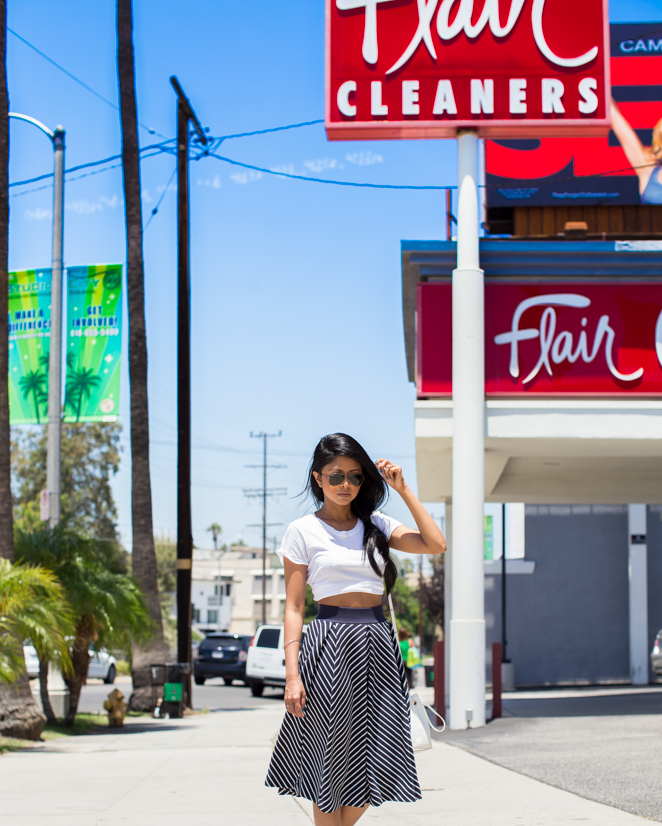 Wore this look on Sunday to the Farmers Market. Some of my favorite outfits are when I’m in a rush and have to throw something together quickly. I prefer not to over-think it, so I find a key piece then build around it. In this case, the first thing I picked was this midi skirt from French Connection. Since I knew I was going to be out in the sun, I wanted to keep it comfortable so I paired it with a plain white tee that I pulled back and knotted to give it a cropped effect.