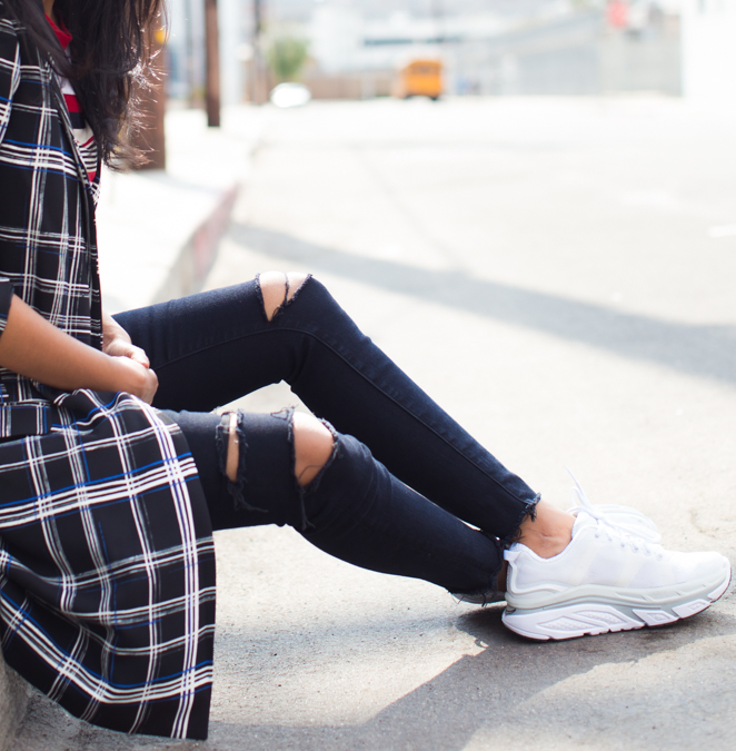 Workin’ a casual look from a couple weekends ago. When I got these Hoka One One sneakers in the mail, I knew they’d be a perfect complement to a chill and laid back outfit for a trip to downtown LA to grab some killer hot dogs with the hubby. Love the little boost in height and these really well padded sneakers made me think I could run around all day thanks to how comfy they are!