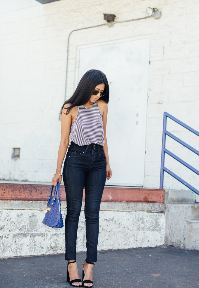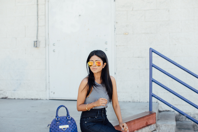 Top: NYTT / Jeans: YMI / Bag: Onna Ehrlich / Sunglasses: Foster Grant / Jewelry: Brandy Pham / Shoes: Steve Madden
