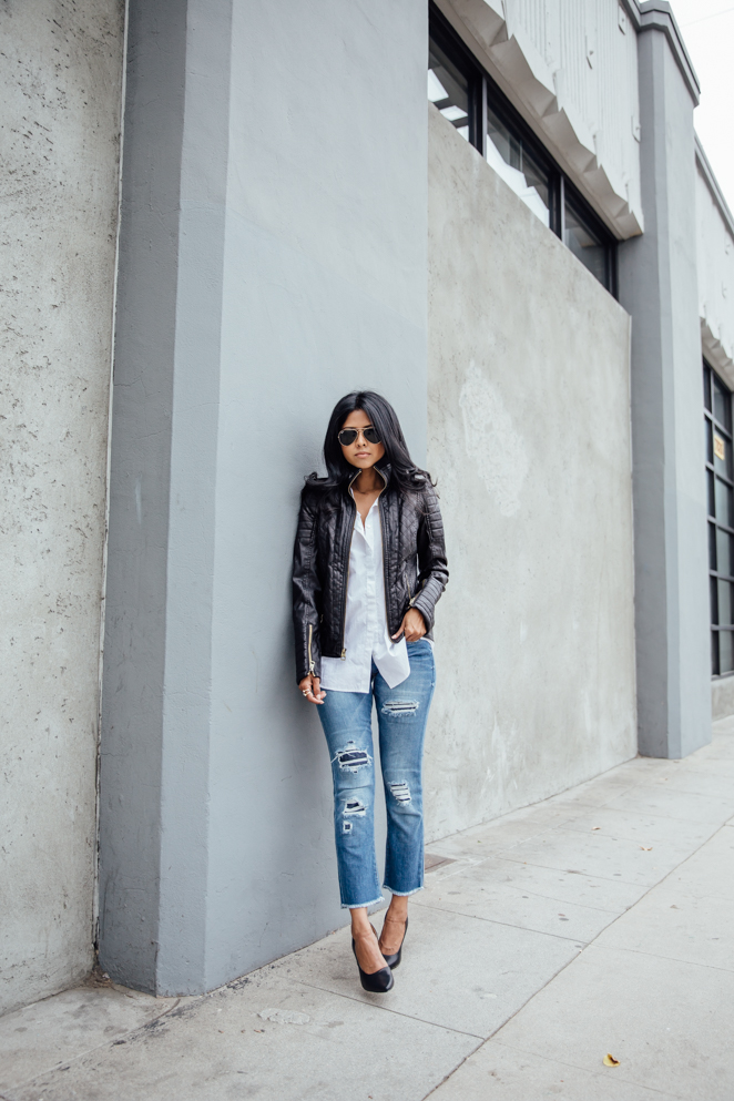 As for my 2nd look, I kept it classic with a quilted leather jacket styled with a white button down. This is a look you can never go wrong with. Always a winner, always edgy and always one of my favorites.