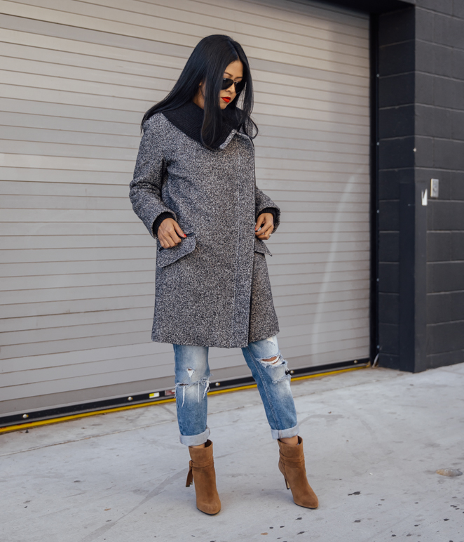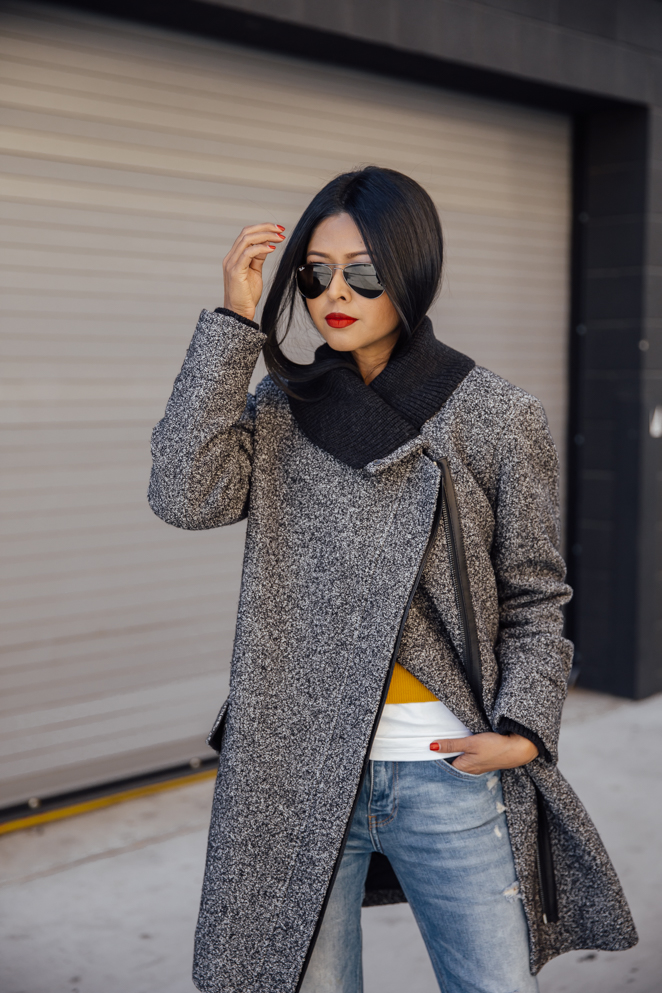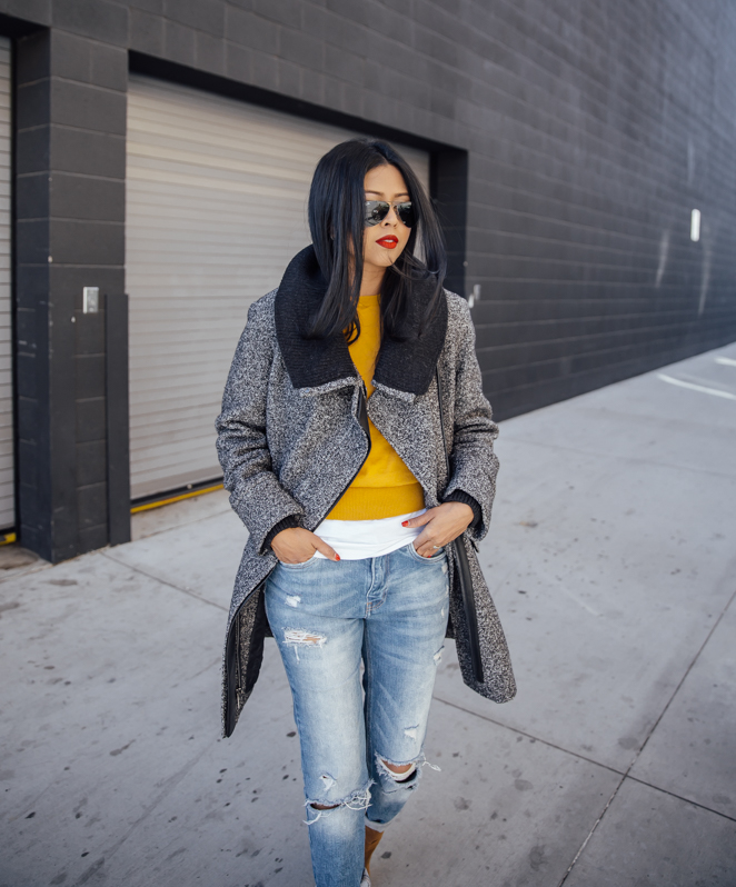 I love dressing for cold weather but unfortunately (or fortunately, depending on your viewpoint) LA doesn’t always cooperate. But when the weather permits, I love getting to play around with all my coats and sweaters. Most times I adore the idea of a neutral colored overcoat only because it will pretty much go with anything in your wardrobe. Camel, grey or black are examples of colors that I tend to favor. For this look, I layered this fabulous grey overcoat over a plain white tee and a mustard sweater to give it a pop of color which is perfect for a casual day out.